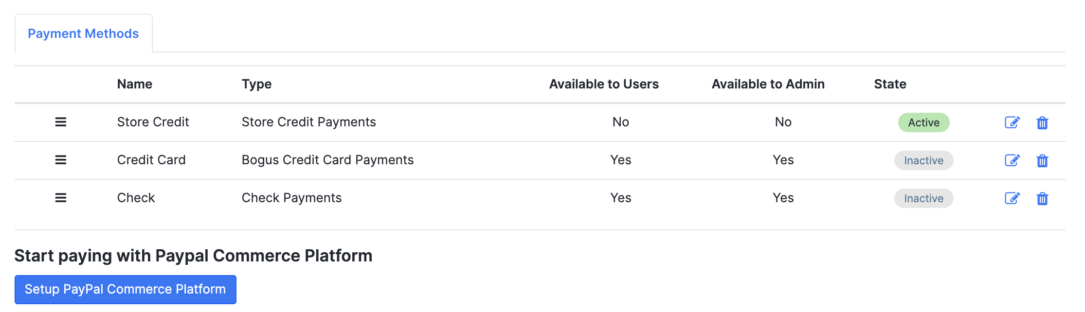 Once installed, hooking your PayPal account to the store is simple. Go to the admin payment_method index, and you should now see a setup button for PayPal Commerce Platform.